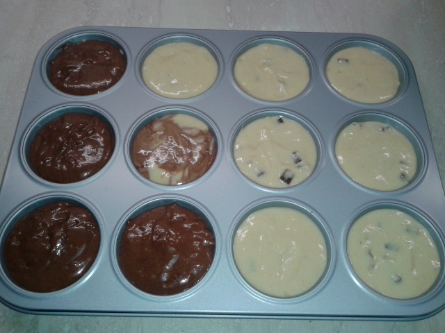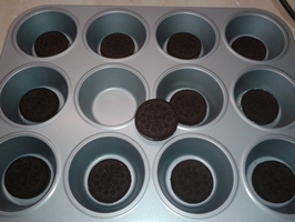 Se tapeteaza tava pentru briose cu hartie, ulei sau faina, dupa care se pune aluatul cu o lingura in tava de briose ( nu se umplu formele de briose complet, de preferat ¾ din inaltimea formei) . In formele de briose mai intai se pun Biscuitii apoi se pune aluatul peste biscuiti.