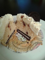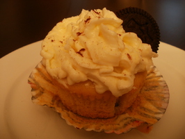 Se scot briosele din cuptor si se lasa sa se raceasca, dupa care crema de branza o punem intr-un Pos pentru spritat cu capatul in forma de stea sau floare si se spriteaza briosele. Peste crema presuram putina cacao si ornam cu biscuit Oreo.