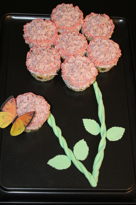 Se foloseste o tava mare, se aseaza briosele in forma de floare, se pun tulpinile din fondant, frunzele iar la sfarsit se pune fluturasul.