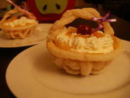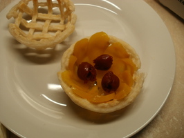 Se pune la cuptor aproximativ 30 min la 180 grade. Intre timp se mixeaza frisca lichida si piersicile se taie felii subtiri. Dupa ce cosuletele sau copt se scot din cuptor si se lasa la racit. Pe fundul cosuletului se pun felii de piersici dupa care se pune frisca batuta, iar la sfarsit se orneaza din nou cu felii de piersici, visine si se fixeaza manerul cosuletului in frisca .