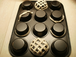 Foaia se taie in patrate de 10 cm x 10 cm apoi cu un cutit sau cu o rola cu model se taie fasii de aluat. Se foloseste o tava cu forme de briose, se intoarce si se pun fasiile de aluat in forma unui cos impletit apoi se face si manerul de la cosulet.