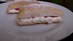 Dreptunghiurile de aluat coapte se taie pe lungime in doua si la mijloc se pune frisca iar peste frisca se pune sosul de zmeura iar deasupra a doua parte a foii . Deasupra se pune putin zahar pudra.