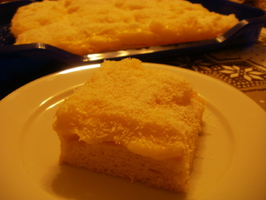 Siropul de la ananas se pune intr-o cratita sa se incalzeasca iar bucatile de ananas se pun la scurs intr-o sita(daca sunt bucati mari de ananas atunci trebuie taiate mici). Siropul se completeaza cu apa pana la 500 ml si se adauga cele 2 budinci si 120 gr. zahar. Dupa ce budinca sa ingrosat se ia de pe foc si se lasa la racit, cand sa mai racit se adauga untul in budinca si ananasul. Dupa ce blatul sa racit se pune crema si la sfarsit se pun fulgii de cocos.