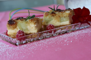 Peste blatul racit se pune crema de branza, iar deasupra cubuletele de rabarbar.Urmeaza ultima etapa a prajiturii, peste crema de branza si rabarbar se presareaza ( se sfaramiteaza) aluatul pus deoparte ( sfertul de aluat pe care l-am pus deoparte la inceput). Prajitura se baga din nou in cuptor la 160 grade C – 45 minute.