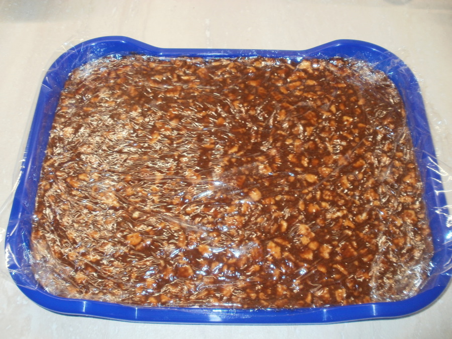 Se ia o tava in care se pune folie alimentara si se intinde compozitia apasand pana se uniformizeaza, iar deasupra se pune din nou folie alimentara si se apasa cu degetele pana blatul devine o masa compacta.
