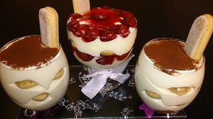 In pahare se pune un strat de piscoturi - crema Mascarpone- ( sos visine) apoi din nou piscoturi-mascarpone- (sos visine), deasupra se orneaza cu cacao si Piscoturi.