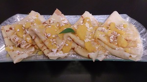 Clatitele se aseaza pe farfurie si cu o lingura se pune sos si felii de Portocale in interiorul clatitelor,iar sosul si feliile de Portocale care au ramas se toarna peste clatite . La urma se pun fulgii de migdale si la sfarsit se presoara zaharul pudra.