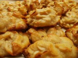 Se amesteca mai intai untul cu zaharul, zaharul vanilat si apoi se adauga frisca si faina. Se amesteca foarte bine pana se incorporeaza bine faina iar la urma adaugam fulgi de migdale si amestecam bine. Se pregateste o tava tapetata cu hartie de copt iar cu o lingurita se ia din compozitie si se aseaza gramajoare mici in tava . Se coc la 180 grade circa 20 minute. Optional se pot da prin glazura de ciocolata.