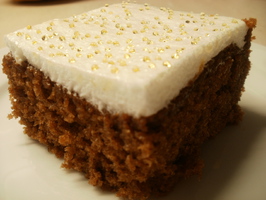 Albusurile se mixeaza cu zaharul pana se obtine o spuma tare. Se scoate blatul din cuptor pana nu e complet copt si se intinde spuma deasupra( de recomandat sa se incerce blatul inainte de a se pune spuma, daca blatul este prea moale spuma de albusuri va intra in blat si nu va iesi prajitura prea aspectuasa) . Se baga din nou la cuptor la 150 grade pana ce bezeaua se intareste. Prajitura se lasa in cuptor sa se raceasca.