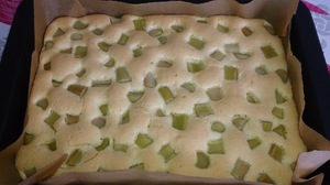 Rabarbarul se spala, se curate de coaja si se taie cubulete. Ouale se separa, albusurile se mixeaza cu zahar, zaharul vanilat. Galbenusurile se amesteca cu ulei si coaja de lamaie . Galbenusurile se toarna peste spuma de albusuri. Se adauga faina, praful de copt si se amesteca bine. Compozitia se toarna intr-o tava tapetata cu hartie de copt si deasupra se aseaza rabarbarul taiat cubulete.