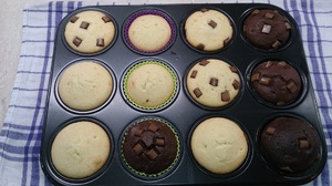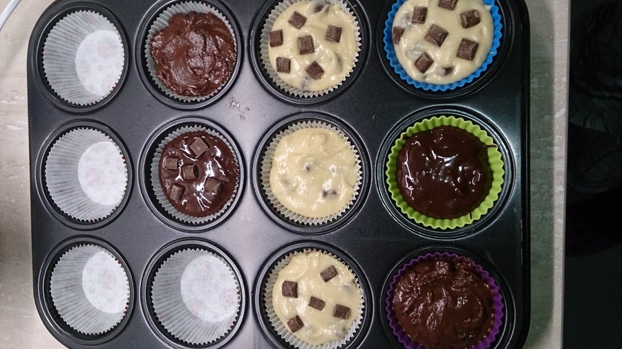 Untul se mixeaza cu zaharul, apoi se adauga ouale, esenta de vanilie si se mixeaza din nou. Se pune sarea , praful de copt,laptele si treptat faina dupa care se mixeaza bine. Optional la sfarsit se pun fulgii de ciocolata si se amesteca. Pentru a varia aluatul se adauga cacao, aluatul se imparte in doua si intr-o parte se pun 3 lingurite cacao dupa care se amesteca bine.