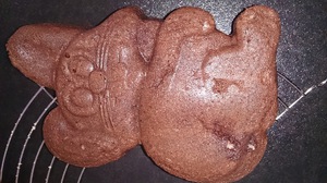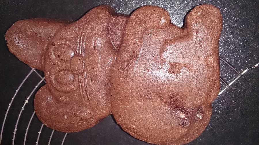 Ciocolata alba si cea neagra se topesc pe baie de aburi. Se pune ciocolata alba topita in forma de iepuras iar peste se pune iepurasul copt si se baga din nou la cupotor aproximativ 15 min, se repeta procedura si la cel de-al doilea iepuras dar cu ciocolata neagra si se baga 15 min. la cuptor. Se scot iepurasii de la cuptor si se lasa la racit iar pe parti iepurasii se imbraca cu fulgi de cocos.
