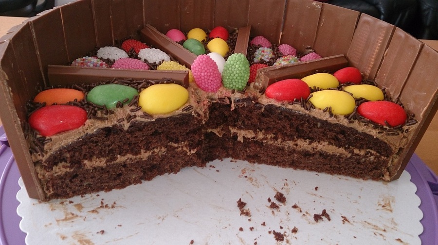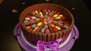 Pe marginea tortului asamblat se pun batoanele de ciocolata Kit Kat iar in mijloc se fac triunghiuri cu batoane de ciocolata, se pune haribo in forma de oua si printre oua se presoara bucatele mici de ciocolata .