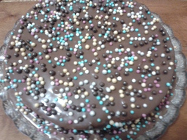Se topeste din nou ciocolata neagra pe baie de aburi si adaugam 2 linguri de lapte ca sa nu se intareasca. Turnam ciocolata deasupra tortului iar unde este nevoie cu un cutit de patiserie se intinde ciocolata pana ce toata suprafata tortului este uniform imbracat intr-un stat de ciocolata. Deasupra se orneaza cu bombonele de zahar de diferite culori.