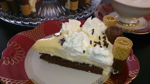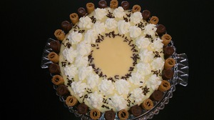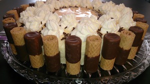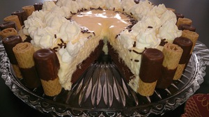 Blatul se aseaza pe un platou rotund si cu o paleta se pune pe marginea blatului crema, dupa care se pune inelul reglabil pentru torturi, se fixeaza bine iar deasupra blatului se pune crema ramasa. Se tine la rece aproximativ 3 ore, apoi se scoate inelul de metal din jurul tortului si pe margine se aseza rulourile de napolitana cu ciocolata. Se pune la frigider inca 2 ore sa se intareasca crema. Cel mai bine sa se lase peste noapte la frigider si apoi sa se serveasca. La sfarsit se pune frisca pusa deoparte pentru ornat intr-un Pos si se orneaza tortul, la mijlocul tortului se pun cateva linguri de lichior oua si se orneaza cu fulgi de ciocolata.