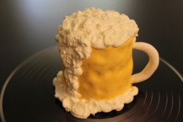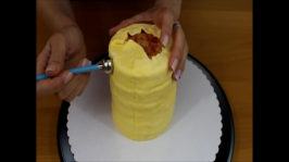 Fondantul galben se intinde foaie, apoi foaia se pune peste tortulet. Cu mainile se apasa usor fondantul ca s-a se lipeasca de tort. Cu o forma mica rotunda se face structura halbei. Pentru manerul halbei se foloseste o sarma care se imbraca cu fondant alb.