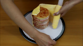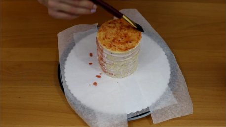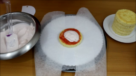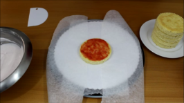 Se ia unul din cele 5 cercuri de blat si se pune pe o farfurie , se pune un strat subtire de sos capsuni, apoi se pune un strat de crema Mascarpone. Se repetam aceeasi procedura pana se utilizeaza toate cercurile de blat. Cu o pensula se apica pe toata suprafata tortuletului un strat de sos capsuni . Inainte de a imbraca tortuletul cu fondant se pune la frigider.
